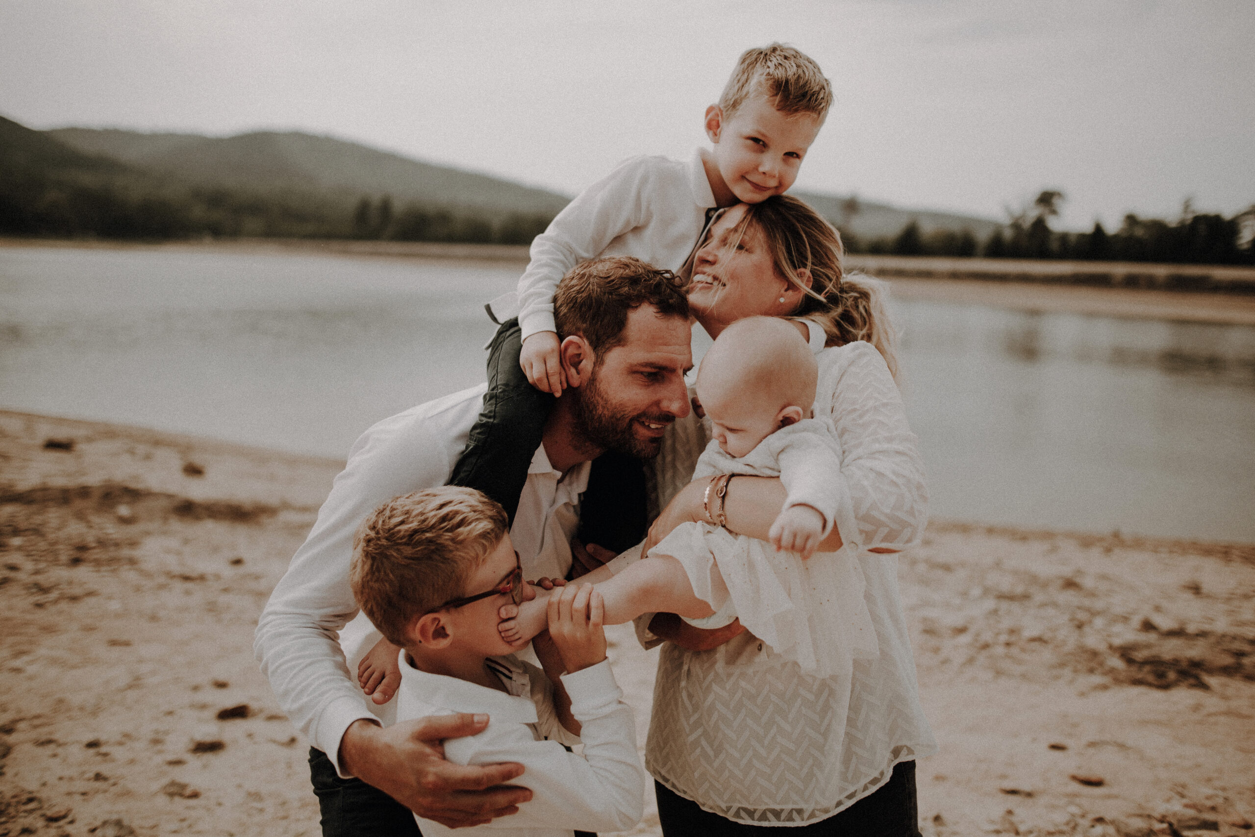Pauline, Renaud et Raphaël. Voici qui j’ai rencontré quand je suis rentrée dans la famille il y a quatre ans. Le trio attendait bébé Gaspard et les premiers moments partagés tous les quatre étaient doux, inspirants et plein de souvenirs déjà. Puis cette rencontre avec Gaspard, ce grand petit frère autour de lui et les souvenirs qui se sont accumulés une fois de plus, donnant à cette jolie famille, une place de coeur dans mes séries bons moments. L’été dernier c’est une petite soeur qui était attendue et c’est avec grand plaisir que je suis allée retrouver la famille prête à s’agrandir et faisant de ce premier moment à beaucoup dans la maison, un joyeux bordel. S’est alors, à nous trois les grands, imposé un moment famille au grand air, pour notre suite autour d’Agathe. Sans surprise (je suis infiniment amoureuse de cet endroit et j’en ai tellement de souvenirs maintenant…), je leur ai proposé du sable, de la pierre et surtout un grand terrain de jeu où il pouvait y avoir un sacré paquet de bêtises. C’était beau, c’était doux une fois de plus, c’était à cent à l’heure tout ça, entre chasse au dinosaure et aux ballons fugueur. C’était simplement de l’amour en famille et moi j’ai eu la chance de partager tout ça avec Eux cinq.